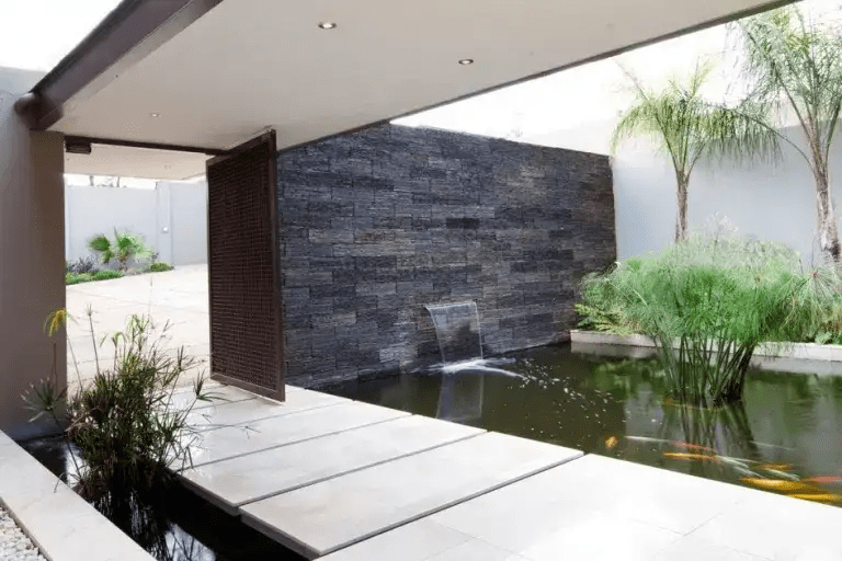 - Kolam Ikan Minimalis dengan Aksen Air Terjun Mini