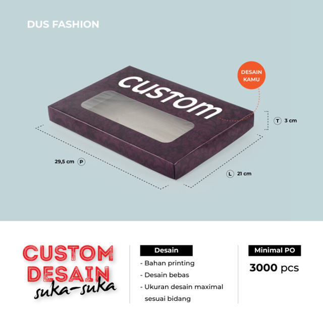 Custom Product menghadirkan produk kemasan dus berbagai ukuran untuk anda yang bergerak di usaha pakaian. Dus ini cocok digunakan untuk dus gamis, atasan, koko, kemeja, dll.